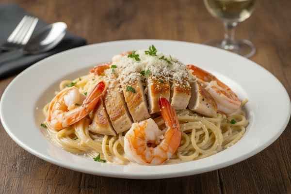 Pasta with Chicken and Shrimp White Sauce